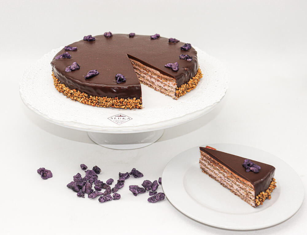 Umhüllt wird die Torte mit einer zarten Schicht aus Nougat und Schokolade! Mit exquisiten, kandierten Veilchen verziert und am Rand mit knusprigem Krokant bestreut.